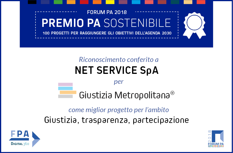 Giustizia Metropolitana® è la soluzione tecnologica sviluppata da Net Service per la digitalizzazione dei processi e l’interscambio telematico tra gli Enti Locali, i cittadini e la Pubblica Amministrazione Centrale. Al Forum PA 2018, la manifestazione dedicata all’innovazione della PA, il progetto di Net Service è stato selezionato, tra i quasi trecento progetti pervenuti, come particolarmente meritevole e inserito nei “100 progetti” dell’ambito Giustizia, trasparenza, partecipazione del premio PA sostenibile.